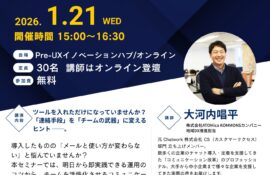 1年の締めくくりに、未来の事業の種を 今年の活動、お疲れ様でした! UX会員交流会を「雑談こそが事業!望年会」と題して開催します。通常のミートアップでは話し足りなかったとのお声もあり、じっくり深い雑談に時間を割くのが今回 […]