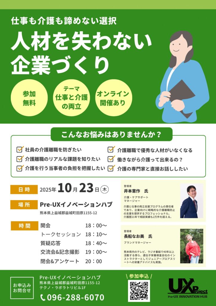 キャリテラスの介護・ケアサポートマネージャー井本憲作さんとブランドマネージャー長船なお美さんをゲストにお招きし、「人材を失わない企業づくり」というテーマでお話いただきます。
