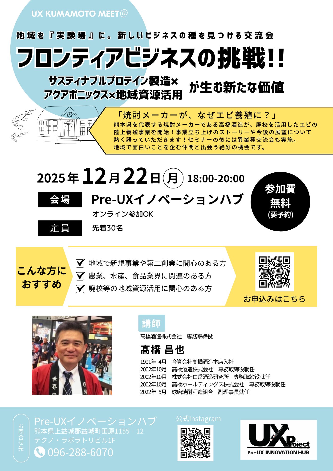 今回は、高橋酒造株式会社・髙橋昌也さんに登壇いただき、「フロンティアビジネスの挑戦~サスティナブルプロテイン製造×アクアポニックス×地域資源活用が生む新たな価値」と題してお話しいただきます。