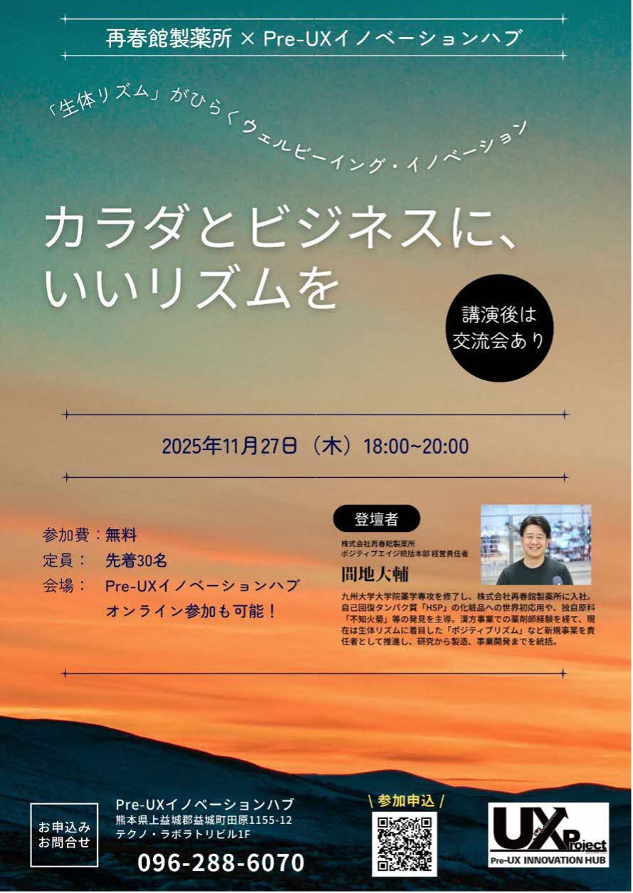 2025年11月27日(木)に”Pre-UXイノベーションハブ”にてKUMAMOTOUXMEET@「カラダとビジネスに、いいリズムを」を開催いたしました。